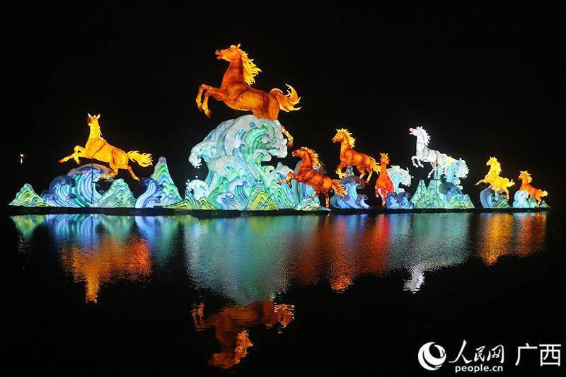 “光驰八骏”灯组伫立水面,八匹骏马造型灵动、气势磅礴。人民网 韦欢摄
